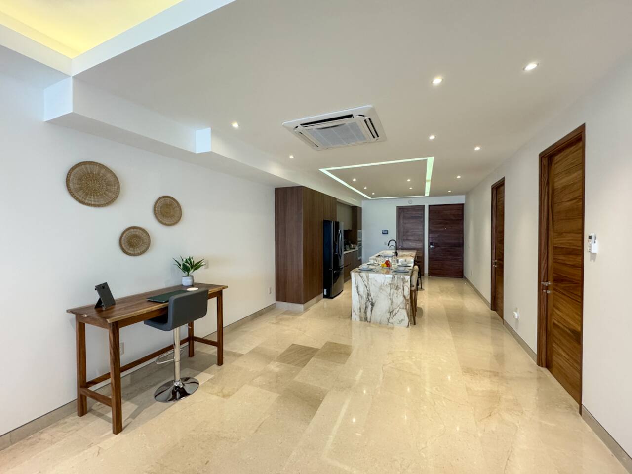 Bedrooms: 2 spacious rooms with comfortable beds and ocean or garden views Bathrooms: 2 full bathrooms plus a convenient half bath for guests Living Area: Open-concept layout with smart TV, dining area, and direct access to the terrace Kitchen: Fully equipped with stove, oven, fridge, microwave, coffee maker, and all essentials Terrace: Large beachfront terrace with BBQ, outdoor dining area, and lounge chairs Amenities: High-speed Wi-Fi, air conditioning, washer/dryer, gym, 2 pools, secure building